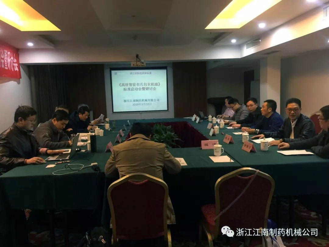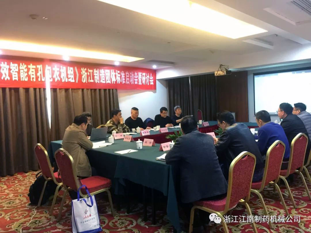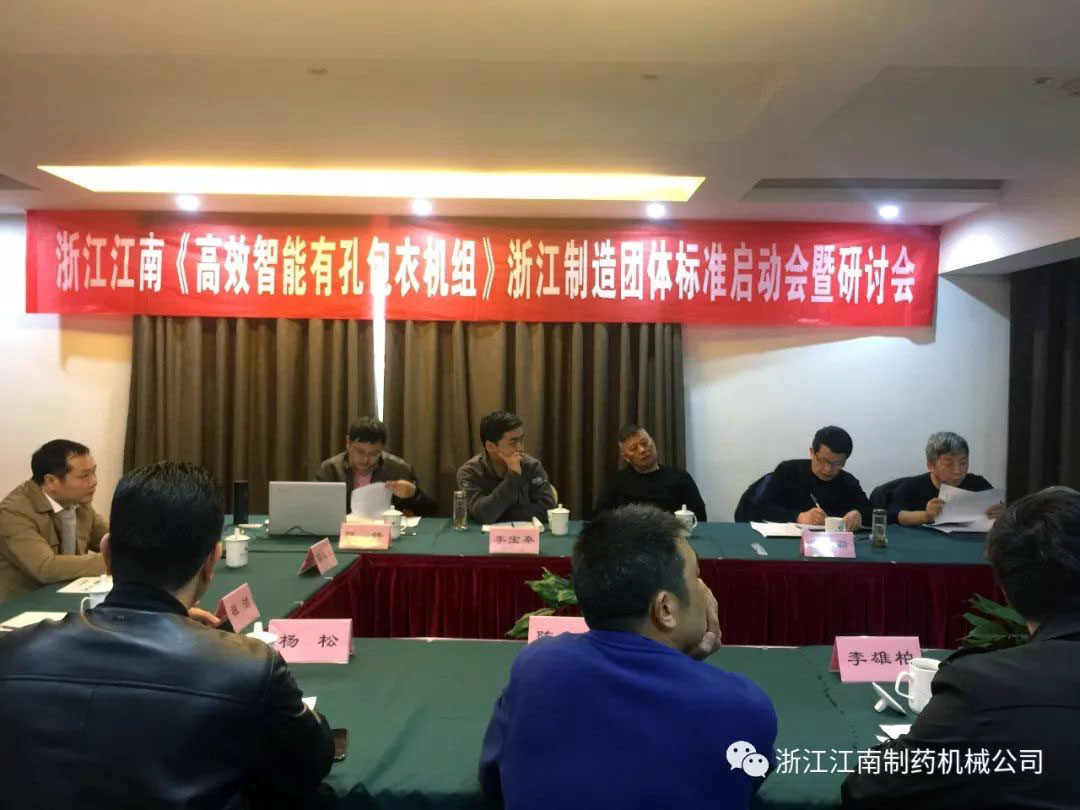 浙江江南制藥機(jī)械有限公司《高效智能滾筒式有孔包衣機(jī)組》浙江制造團(tuán)體標(biāo)準(zhǔn)啟動(dòng)會(huì)暨研討會(huì)3月22日(星期五)下午13:30在瑞安華僑飯店召開(kāi),為了確?!罢憬圃臁睒?biāo)準(zhǔn)的嚴(yán)謹(jǐn),會(huì)議邀請(qǐng)了全國(guó)制藥機(jī)械標(biāo)準(zhǔn)化技術(shù)委員會(huì)主任高工李寶秦、華東集團(tuán)華潤(rùn)制藥有限公司高工沈正良、溫州市工業(yè)設(shè)計(jì)院教授級(jí)高工金建新、溫州職業(yè)技術(shù)學(xué)院博士張潔、溫州市標(biāo)準(zhǔn)化研究院高級(jí)工程師祖潔、瑞安市市場(chǎng)監(jiān)督管理局高級(jí)工程師吳國(guó)華、浙江方圓檢測(cè)集團(tuán)高級(jí)工程師陳鋒、瑞安機(jī)械行業(yè)協(xié)會(huì)秘書(shū)長(zhǎng)金普光及我公司董事長(zhǎng)楊松、工程師李雄柏、張富等多位專業(yè)工程師。工作組專家及成員針對(duì)標(biāo)準(zhǔn)草案進(jìn)行細(xì)致而嚴(yán)格的研討,探討確定了標(biāo)準(zhǔn)的主要內(nèi)容及框架,一致肯定了浙江江南制藥機(jī)械有限公司《高效智能滾筒式有孔包衣機(jī)組》浙江制造標(biāo)準(zhǔn)的先進(jìn)性、準(zhǔn)確性。